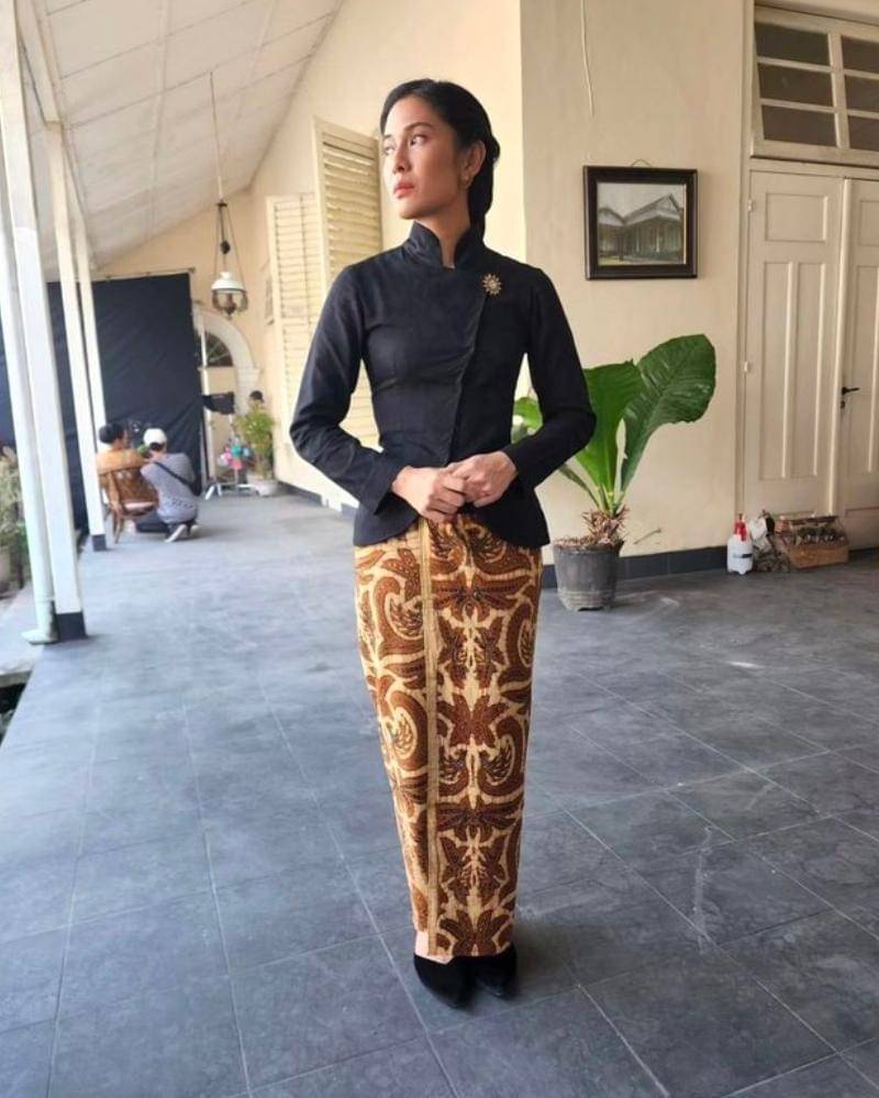 Dilengkapi dengan kain batik berwarna cokelat, dan rambut yang disanggul, menambah aura perempuan Jawa yang berwibawa.