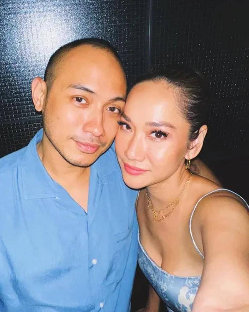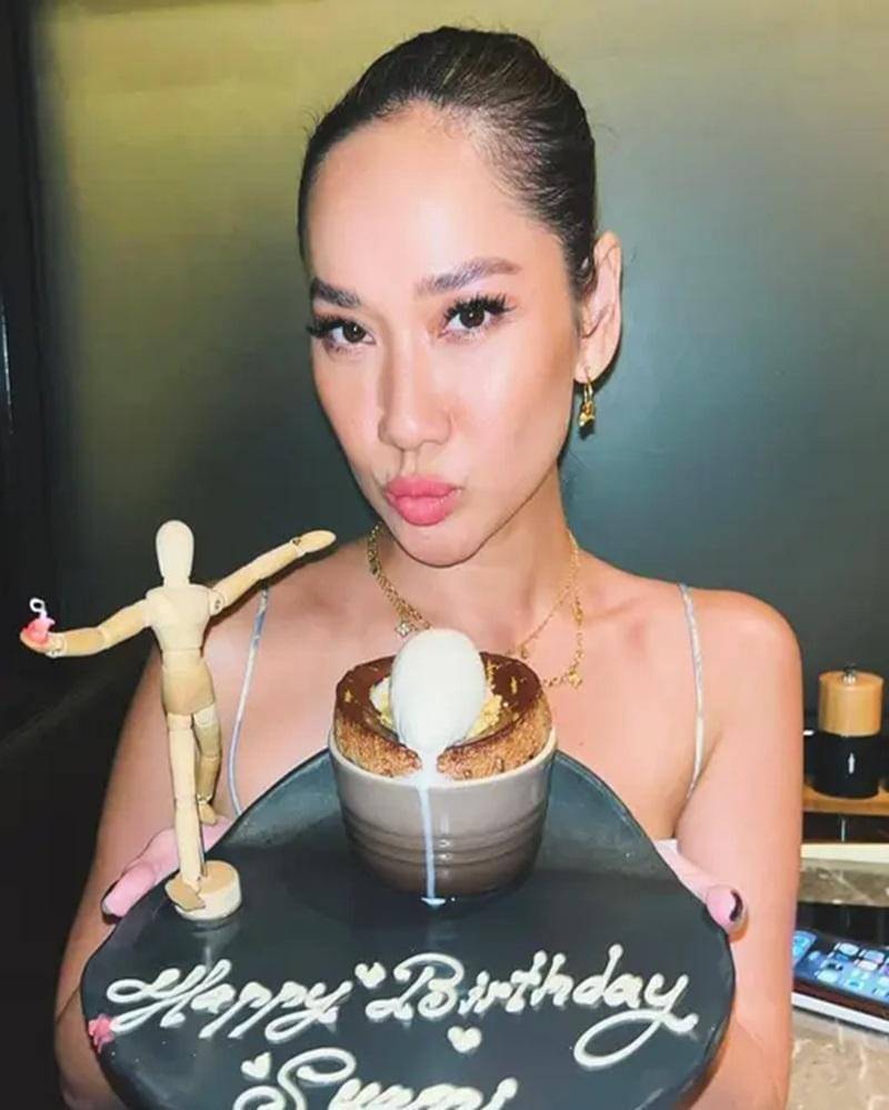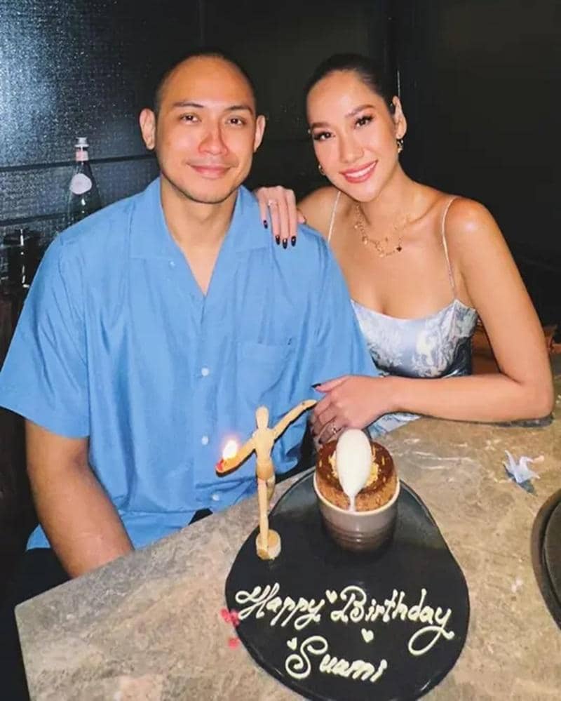 Menghabiskan malam birthday dinner di salah satu resto Korea di Bali, keduanya menyempatkan diri untuk berfoto berdua. Terlihat Tiko mengenakan celana hitam dengan sepatu berwarna senada.