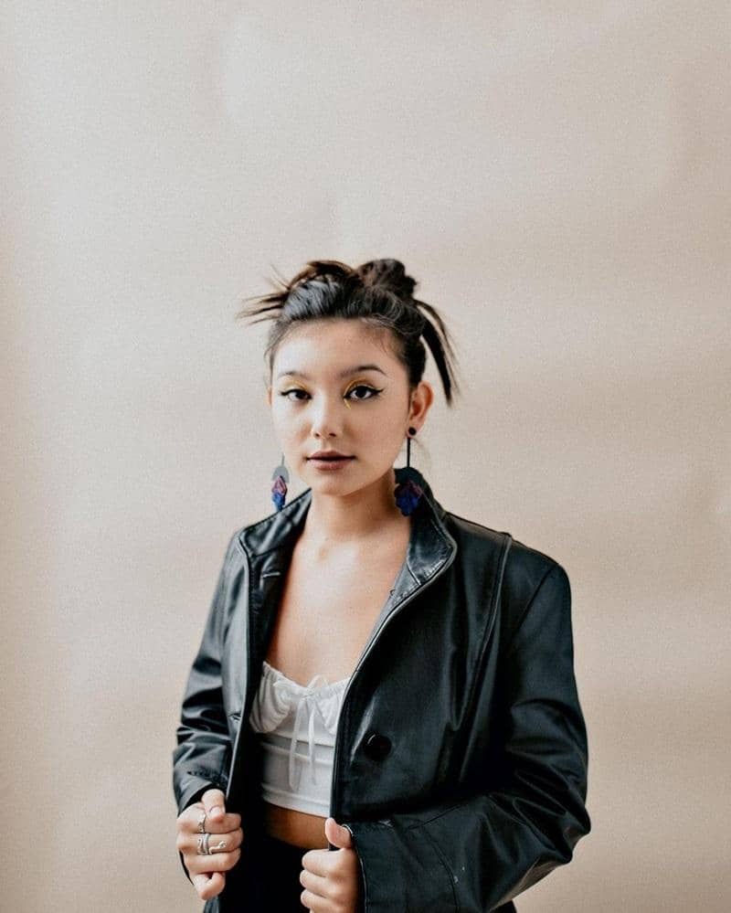 Dalam salah satu sesi pemotretan, ia terlihat begitu fierce dengan make up bold dan outer jaket kulit berwarna hitam. Sentuhan feminin terlihat dari innernya yaitu cropped tank top berwarna putih dengan detail pita kecil di tengah dada.