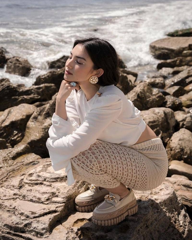 Ia pun cocok dalam gaya yang feminin. Seperti saat mengenakan cropped top putih dan cok rajut berwarna khaki. Detail anting dan cincin pun memberikan kesan yang lebih feminin.