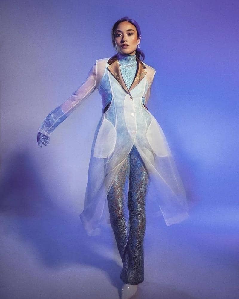Ia terlihat futuristik dengan onesie fit body berbahan brokat. Sedangkan outernya pun terbuat dari lace yang memberikan kesan strong.