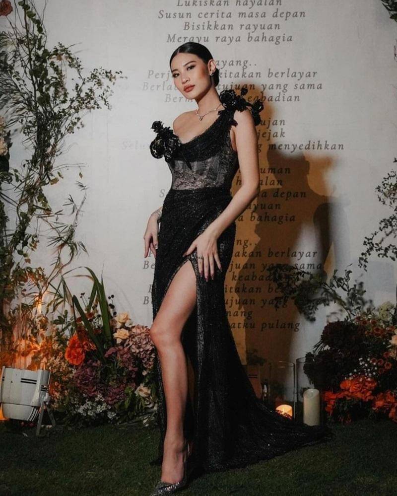 Sedangkan belahan gaunnya yang tinggi memberikan kesan seksi dan elegan.