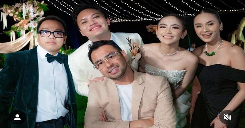 Seperti biasa, Raffi pun didapuk menjadi MC dalam acara resepsi kali ini. Ia tampil dengan kaus berwarna putih dan kacamata frame lebar yang memberikan kesan funky.