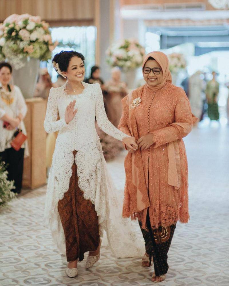 Kebaya yang satu ini merupakan salah satu kebaya spesial, karena Fery memakainya di hari pernikahan sang putri, Mutiara. Pemilihan warna peach membuat kebaya yang Fery kenakan terlihat modern, ditambah kain dengan detail lace, serta selendang yang senada.