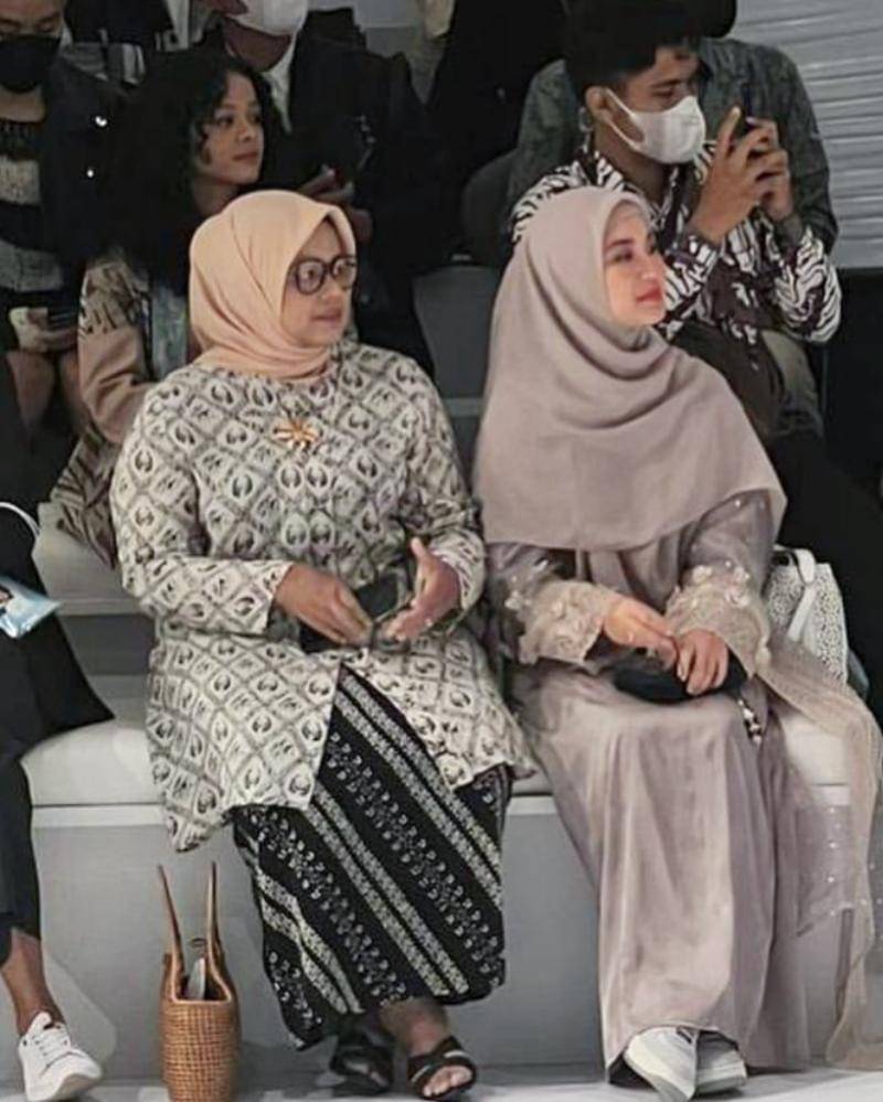 Rok batik juga terlihat memiliki pola yang sama dengan selendang yang Fery kenakan pada lengannya. Sementara, bros berwarna emas di tengah kebaya terlihat serasi dengan clutch berbentuk unik yang dibawa dan hijab yang dikenakan.