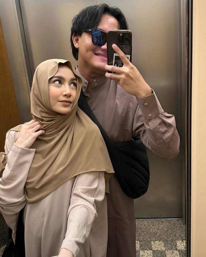Masih dari mirror lift selfie, terlihat pasangan ini kembali mengenakan outfit dengan warna yang matching. Kali ini, keduanya mengenakan warna tone nude.
