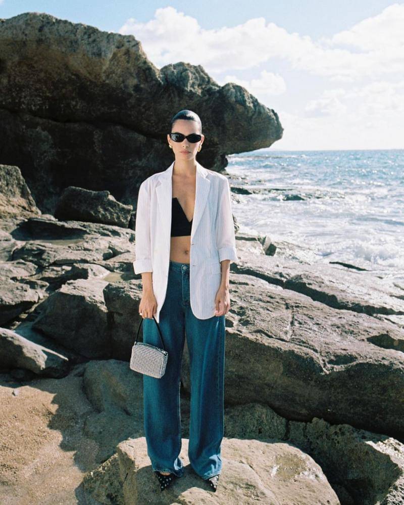 May memakai bralette hitam yang dipadukan dengan jas putih bergaya kasual, serta celana jeans biru berkaki lebar. Untuk menyesuaikan dengan suasana pantai, ia menggunakan juga kacamata hitam, dilengkapi dengan tas kecil berbentuk kotak, dan pointed shoes berwarna hitam.