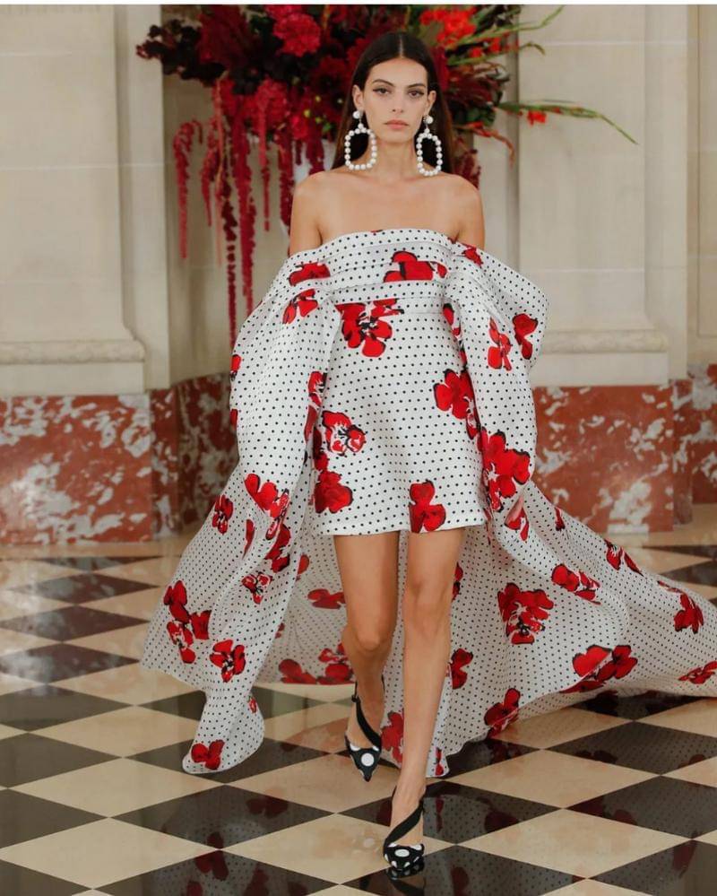 Dengan gaya off shoulder, dress ini memberi kesan sweet tapi tetap classy. May terlihat anggun dalam balutan kain berwarna putih dengan grafik bunga merah. Penampilannya semakin sempurna dengan sepasang anting-anting besar dari mutiara, dan sepatu heels hitam bermotif polkadot.