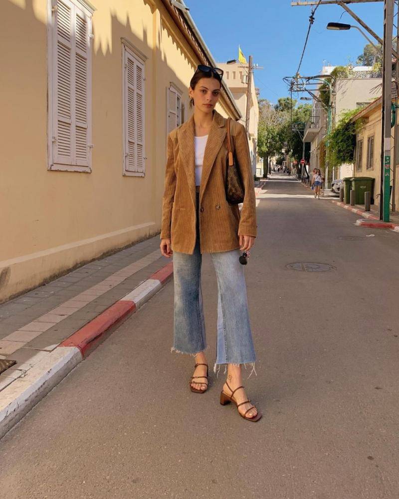 Outfit May Tager kali ini bisa kamu gunakan untuk pergi ke kantor atau sekedar hangout bersama teman-teman. Dalaman berwarna putih Tager padukan dengan celana boyfriend jeans, bergaya unfinished. Dilengkapi oversized blazer berbahan corduroy, berwarna cokelat.