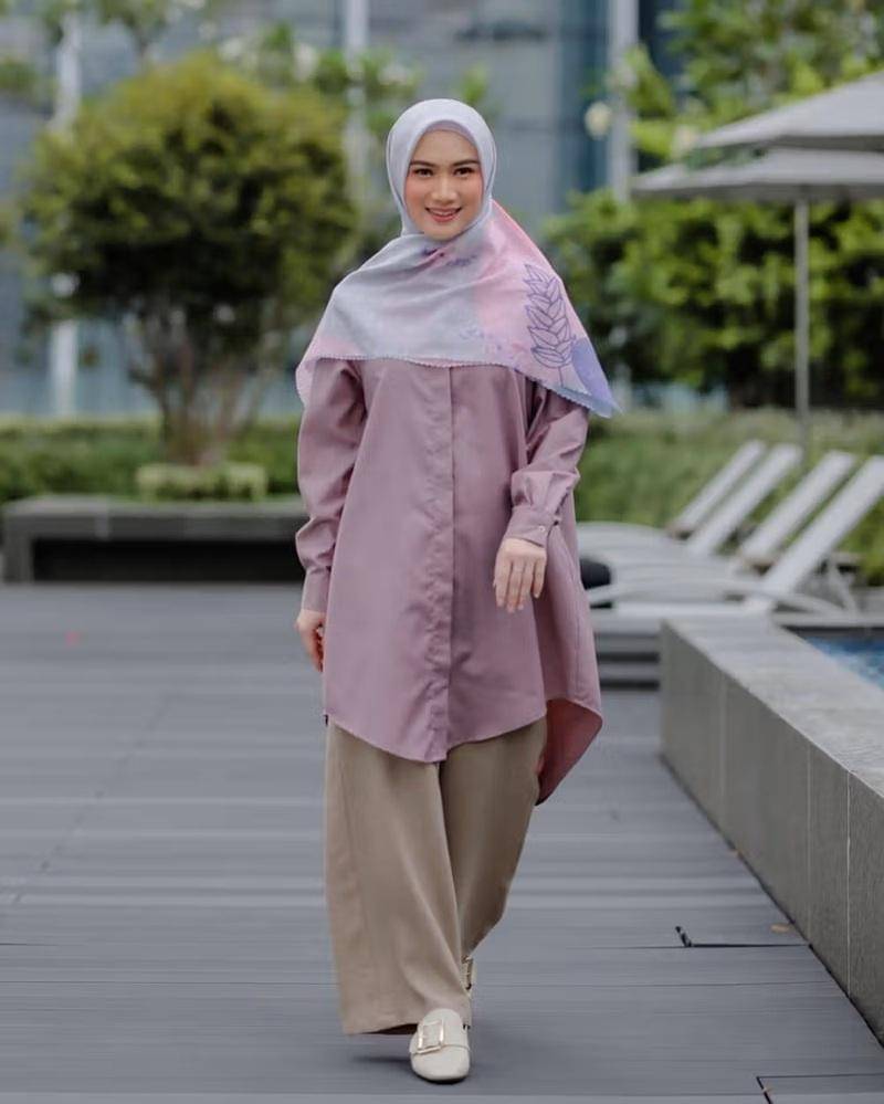 Melody terlihat mengenakan tunik panjang berwarna ungu dan dipadukan dengan rok berwarna cokelat. Cocok!