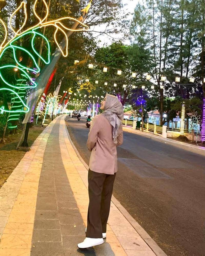 Untuk penampilan yang on point, ia mengenakan hijab berwarna biru.