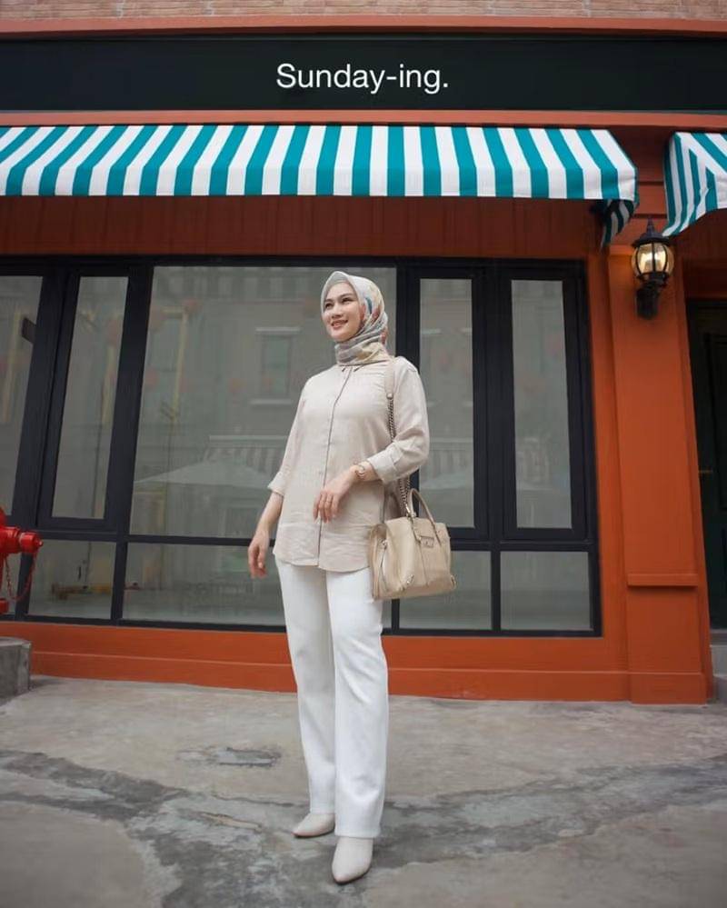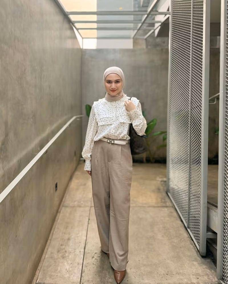 Satu lagi gaya formal yang bisa jadi inspirasi adalah paduan kemeja dan celana kulot. Warna earth tone yaitu krem dan putih memberikan kesan yang feminin.