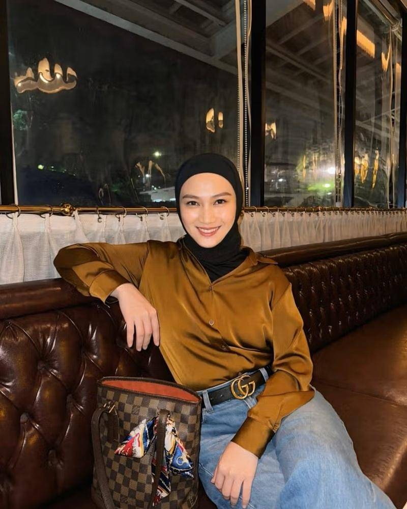 Ia juga terlihat mengenakan kaus abu-abu yang dijadikan inner. Sedangkan untuk hijab, ia memilih warna hitam yang bold namun tetap netral.