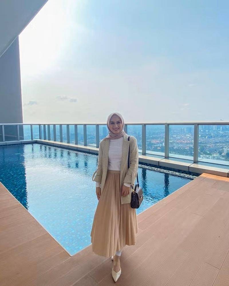 Gaya selanjutnya yang tak kalah stylish adalah rok plisket yang dipadukan dengan blazer. Nuansa formal dan playful terpadu dengan baik.