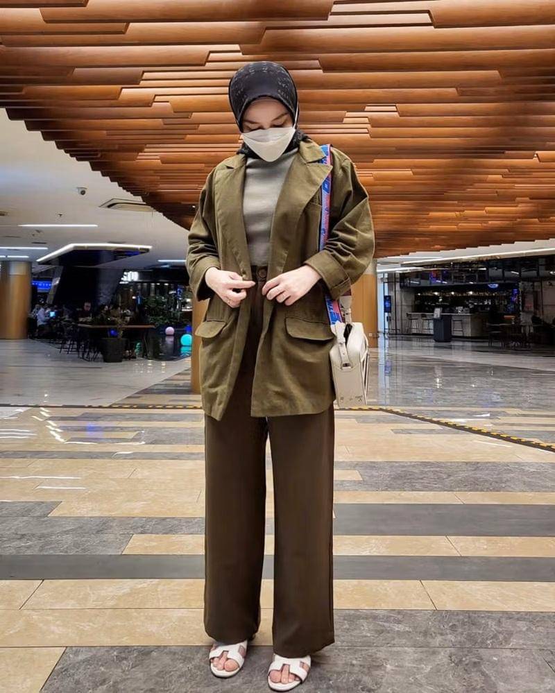 Terakhir, ada gaya casual yang bisa dikenakan sehari-hari. Melody terlihat mengenakan high waist pants berwarna cokelat tua dan blazer jaket berwarna hijau army.