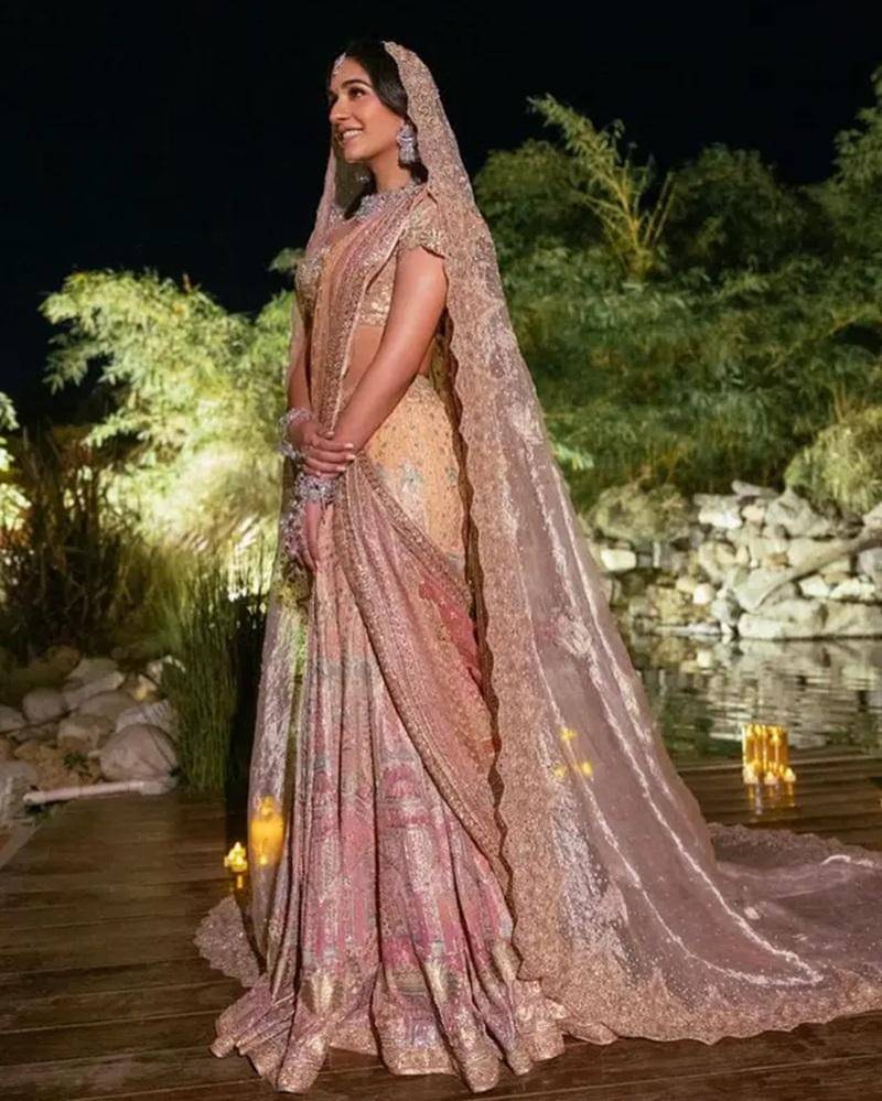 Sebelum pernikahannya, Radhika tampil menawan dengan sari India buatan Tarun Tahiliani. Gaun tradisional India yang dikenakannya dipilih yang berwarna rose gold, dengan taburan detail perhiasan di setiap sudutnya.