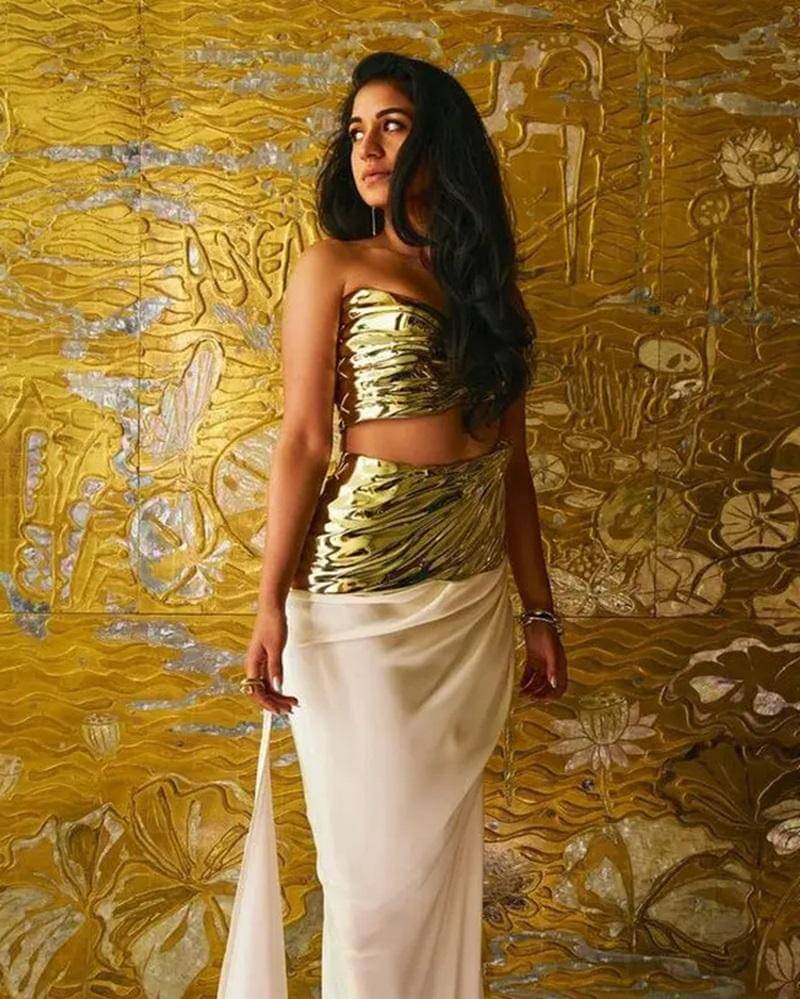 Penampilan selanjutnya tak kalah stunning dari yang lainnya. Radhika tampil seksi dengan atasan tube crop berwarna gold. Detail wavy dari atasan dan pinggangnya memberikan kesan yang menawan.