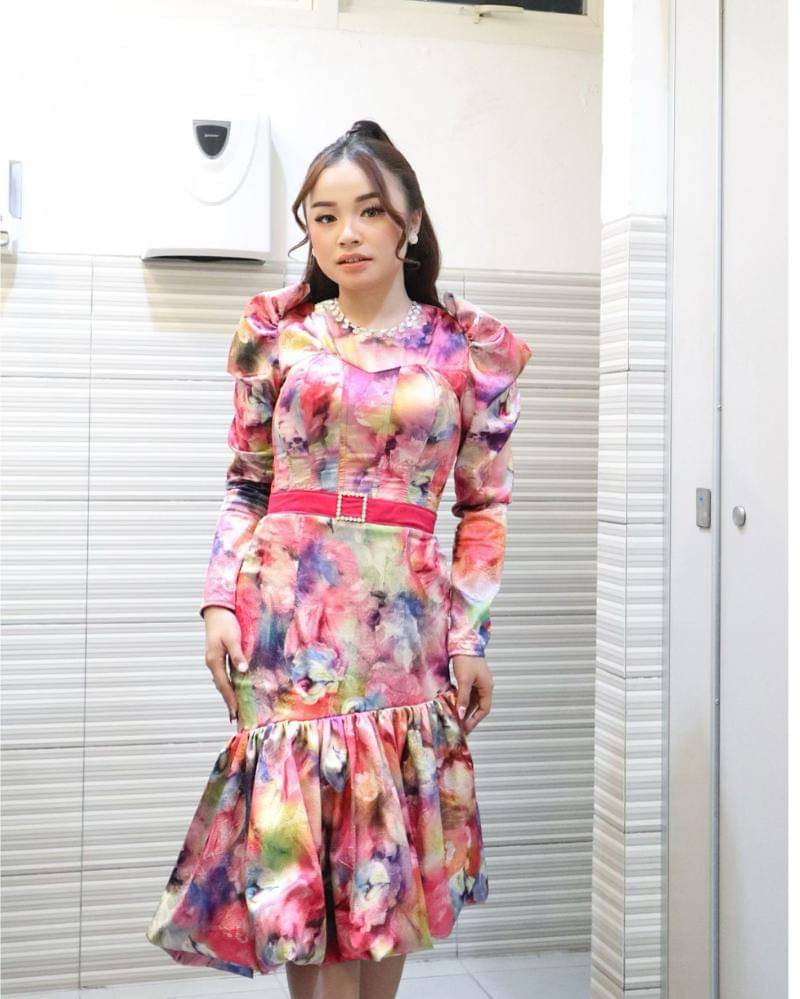 Tasya Rosmala tampil memukau dengan dress colorful yang berkonsep flower abstrak, menciptakan kesan ceria dan dinamis. Desain dress yang kaya warna tersebut menonjolkan kepribadiannya yang penuh semangat.