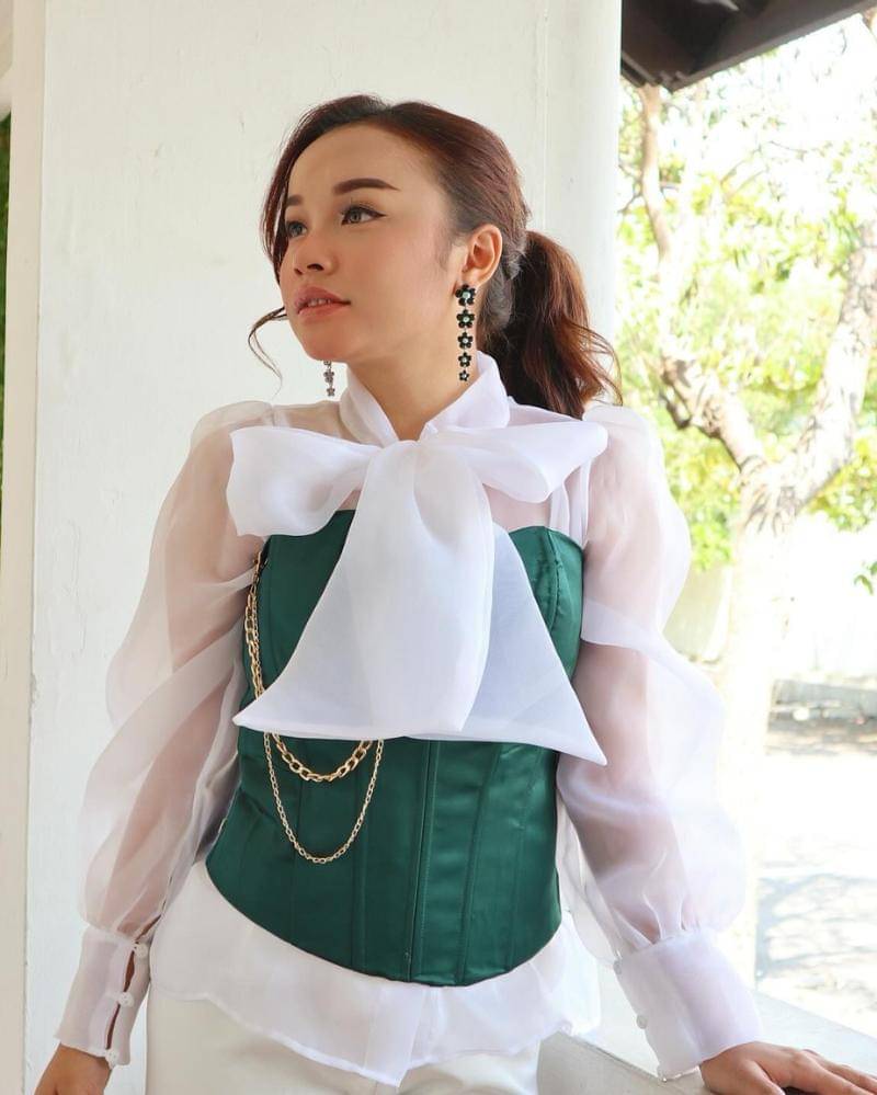 Tasya Rosmala kali ini tampil memukau dengan sentuhan fesyen bergaya vintage Korea. Ia mengenakan pita di leher yang menambah kesan manis dan feminin, serta kain hijau yang membalut tubuhnya dengan anggun.