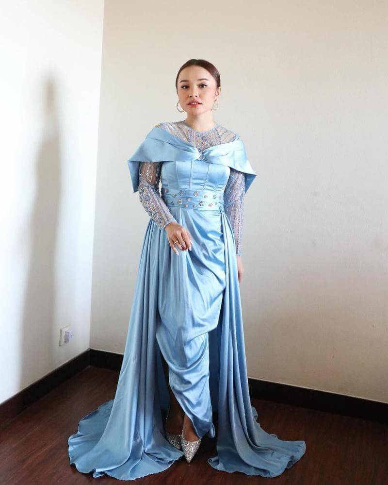 Tasya Rosmala berhasil memukau penonton dengan penampilannya yang anggun mengenakan gaun biru elegan. Gaun tersebut dihiasi dengan brukat halus di bagian lengan, memberikan sentuhan mewah dan mempertegas pesona femininnya.