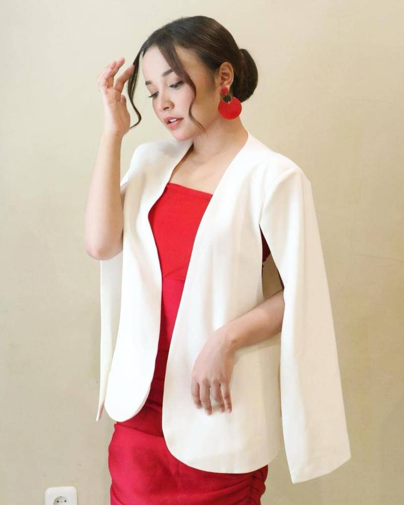 Tasya Rosmala tampil menawan dalam blazer krem yang memberikan kesan feminin dan stylish. Blazer tersebut ia padukan dengan dress lengan pendek berwarna merah yang mencuri perhatian, menciptakan kombinasi warna yang elegan dan berani.