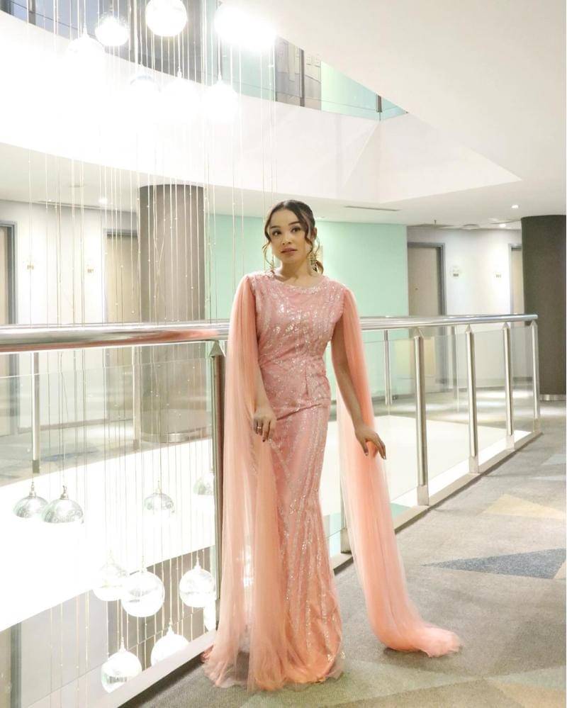 Penyanyi dangdut ini tampil memukau dengan gaya dreamy mengenakan gaun merah muda yang lembut, menonjolkan kesan anggun dan feminin. Gaun tersebut melengkapi tampilan flawless yang membuat kulitnya tampak bercahaya dan segar.