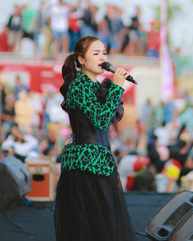 Saat tampil di panggung, Tasya Rosmala memukau penonton dengan dress hijau bermotif abstrak yang unik dan penuh karakter. Dress tersebut dibalut dengan kain hitam yang melapisi beberapa bagian, menciptakan kontras yang elegan dan berani.