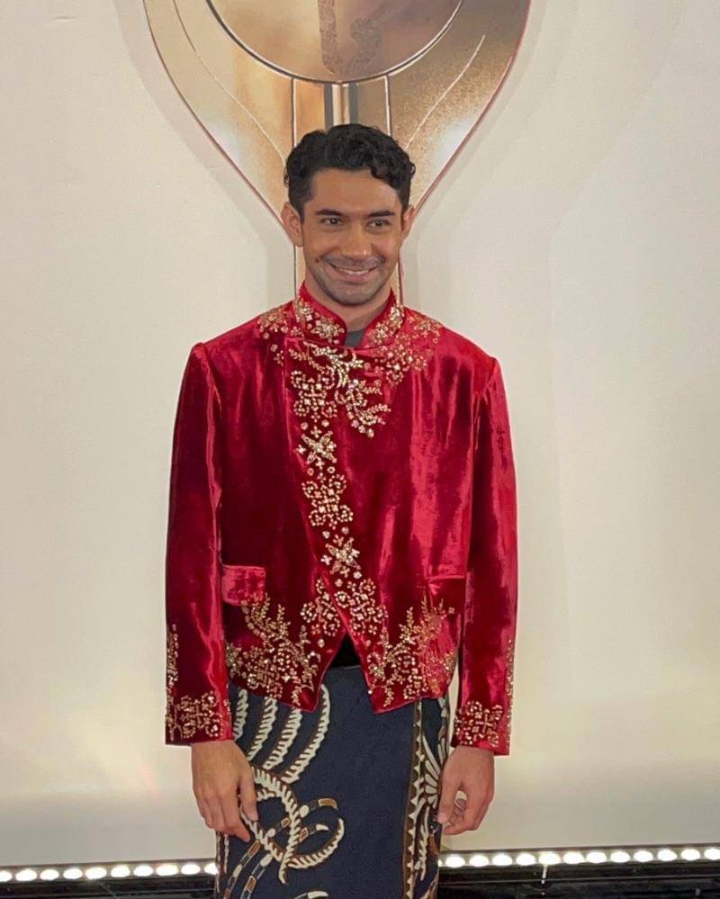Beskap warna merah dengan aksen manik-manik melengkapi penampilan Reza Rahadian. Tampil manly, ia tak mengenakan aksesori atau jam tangan.