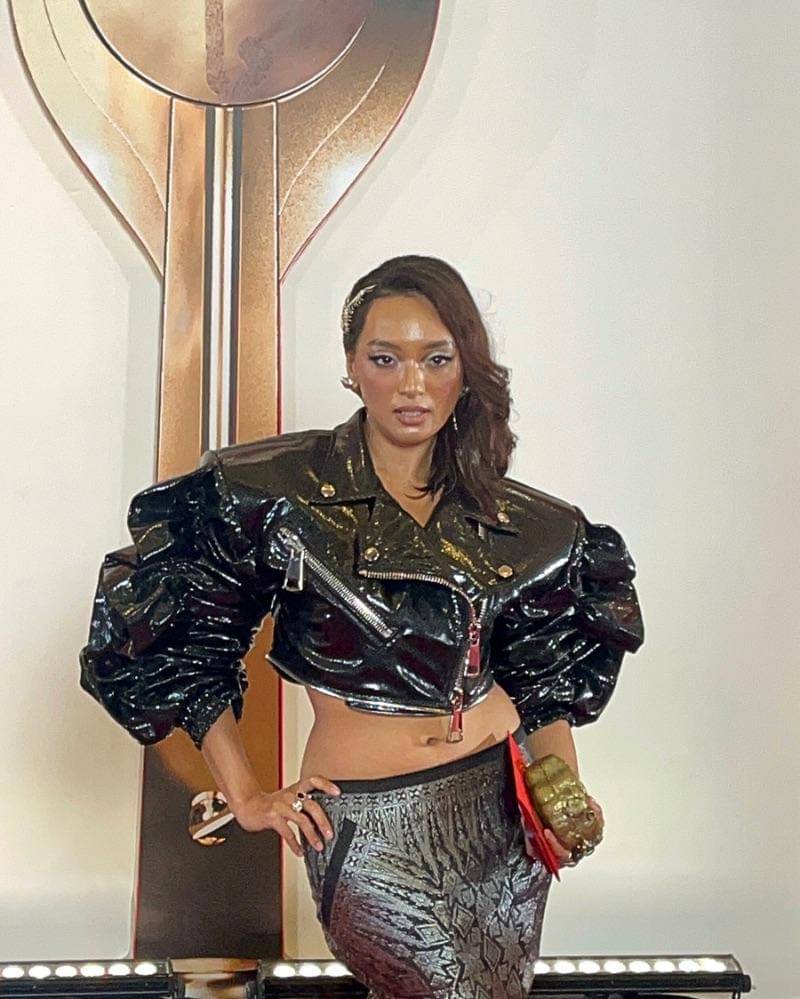Bagian atasnya ia mengenakan jaket semi-parasut dan leather bergaya maskulin. Jaket dengan model crop itu dipadukan dengan kain songket warna hitam dan silver.