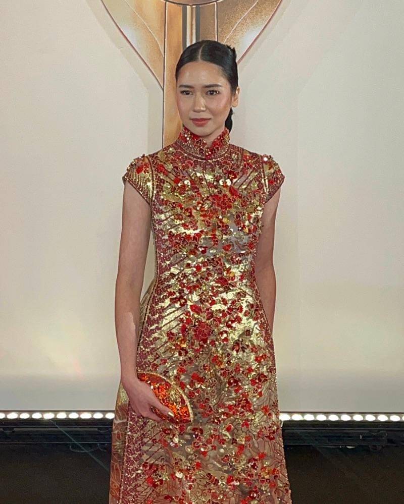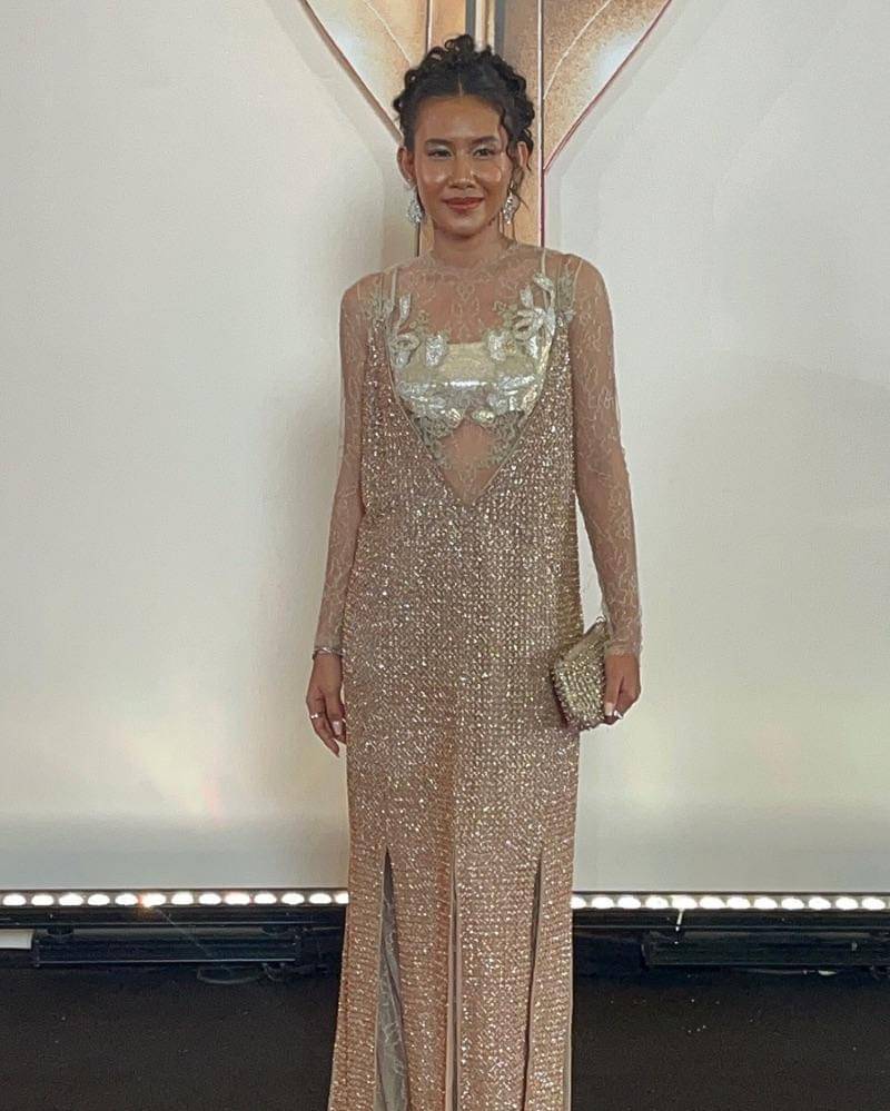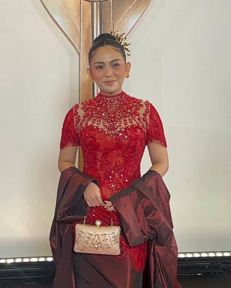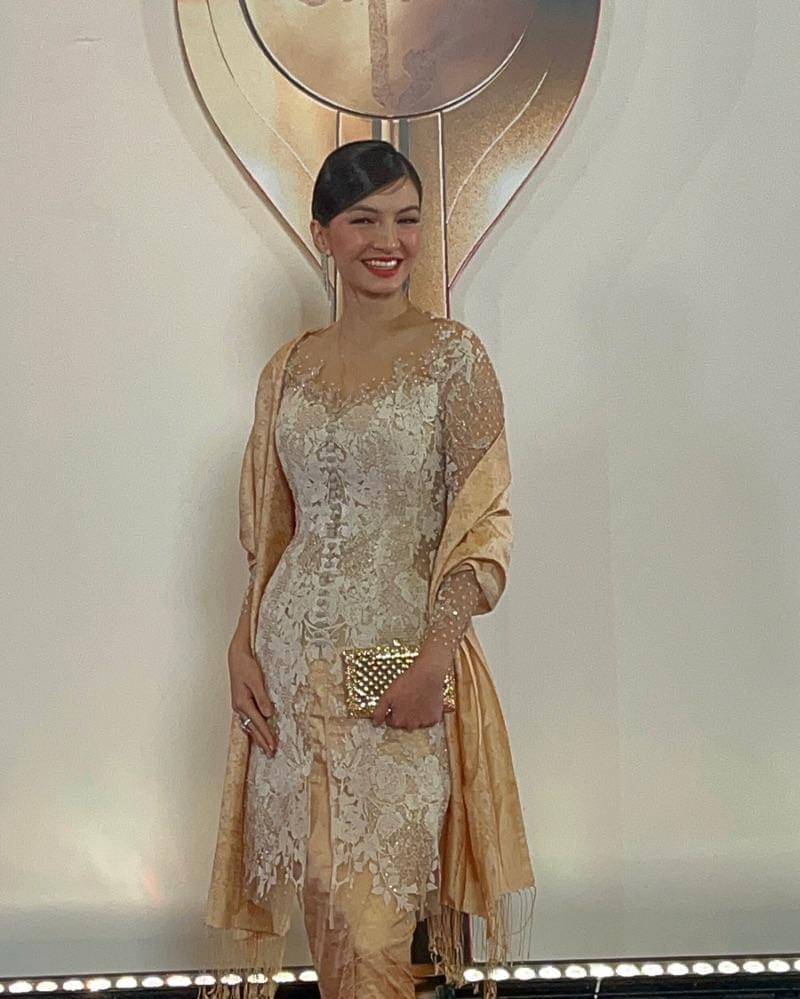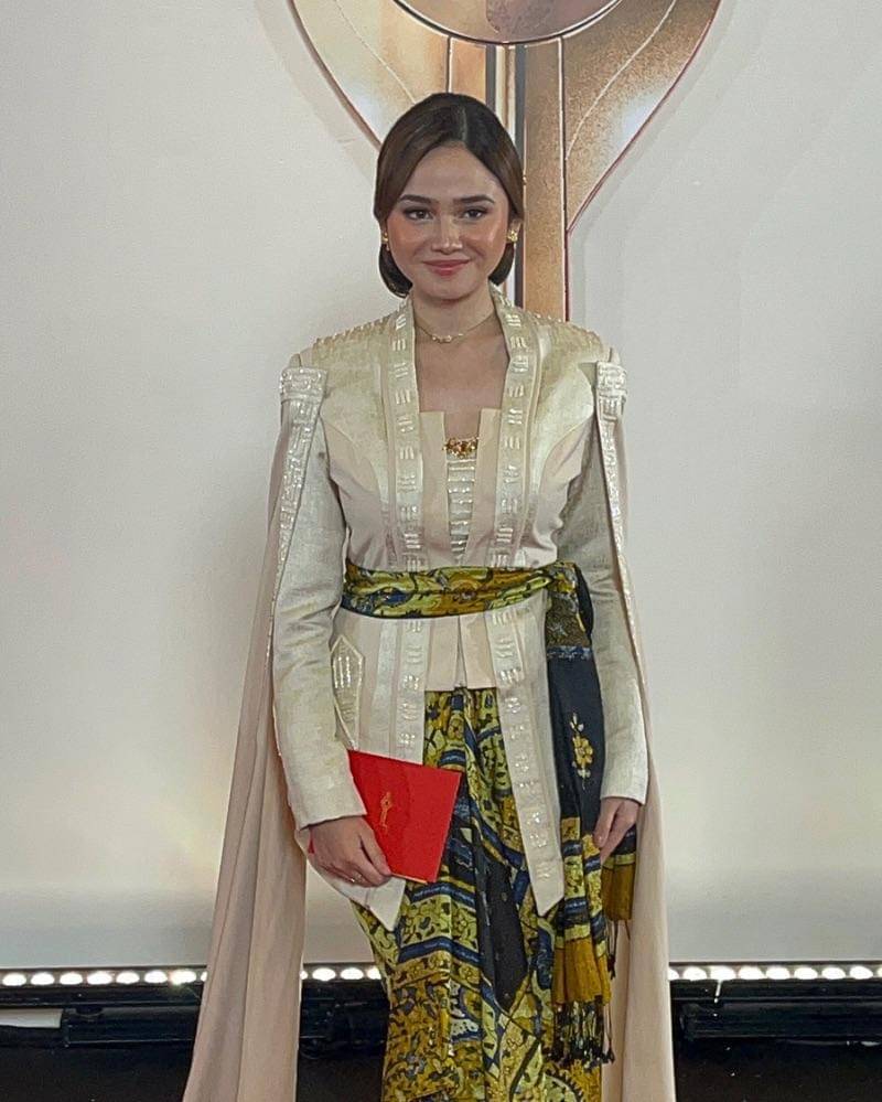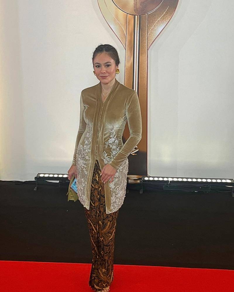 Bak putri raja, Syifa Hadju tampil low profile pada malam red carpet ini. Ia mengenakan kebaya kutu baru modern warna beige cerah.