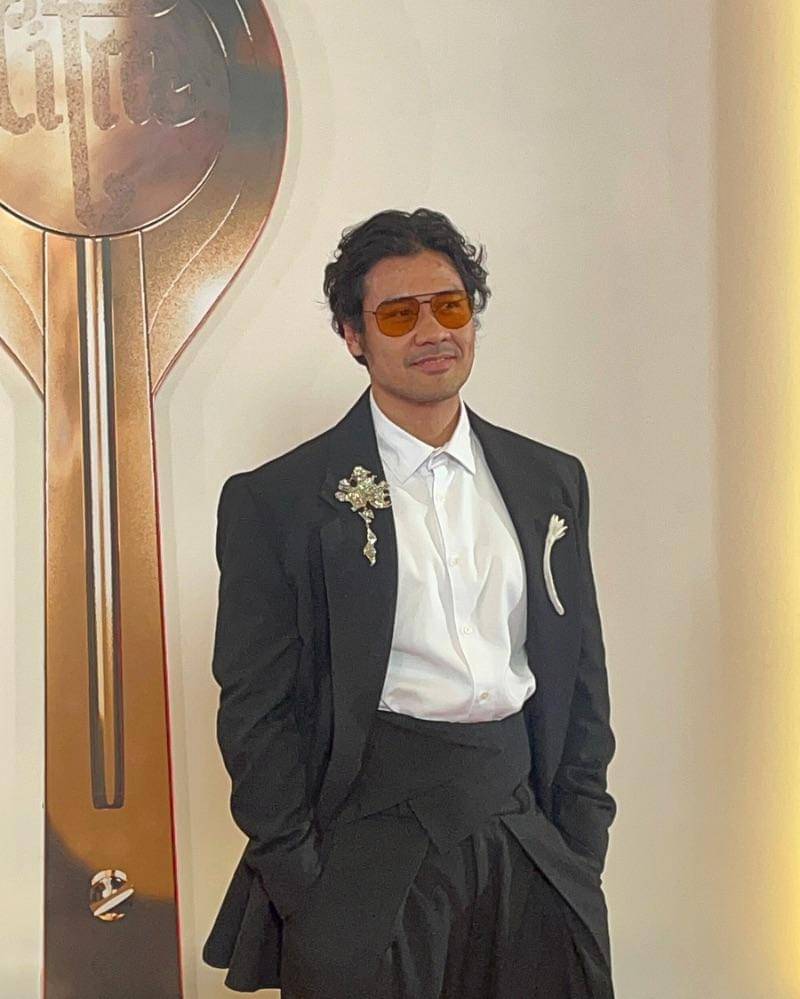 Ia melengkapi penampilannya dengan aksesori pin pada dada kiri dan kanannya. Chicco tampil cukup nyentrik dengan kacamata retro ala tahun 70-an berwarna orange kecokelatan.