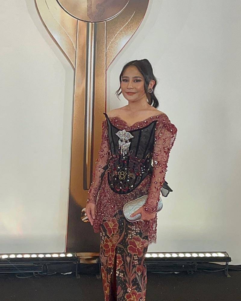 Prilly Latuconsina hadir di red carpet dengan kebaya modern penuh dengan manik-manik dan mutiara. Kebaya dengan bahu terbuka ini di-layer dengan bustier warna hitam dan pin silver cantik yang klasik.