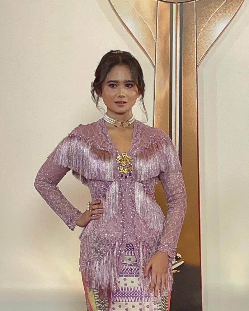 Tampil sangat feminim, Tissa mengenakan kebaya modern paduan warna ungu dan pink. Aksen rumbai di bagian kebayanya membuat penampilannya unik.