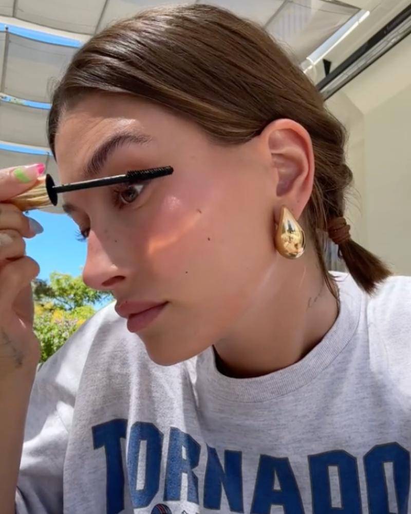 Lalu, Hailey lanjut dengan menggunakan bronzer, ia memolesnya sebagai eyeshadow di pelipis matanya. Ia membuat matanya tetap sederhana dengan sedikit eyeliner cair berwarna coklat dan beberapa sapuan maskara dan gel alis.