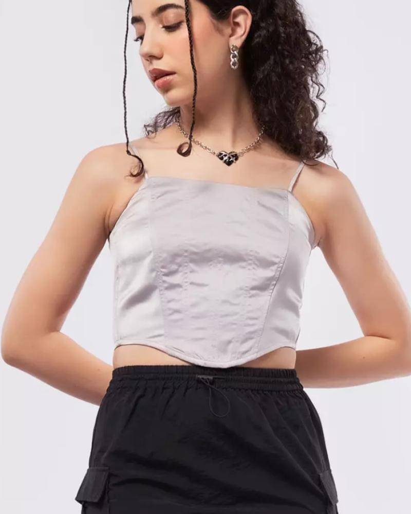 Ada juga tank top dengan bahan satin dan berbentuk crop top yang bisa jadi inspirasi hadiah. Warnanya yang mewah cocok untuk hadiah Natal. Crop top ini bisa digunakan jaket atau long outer.