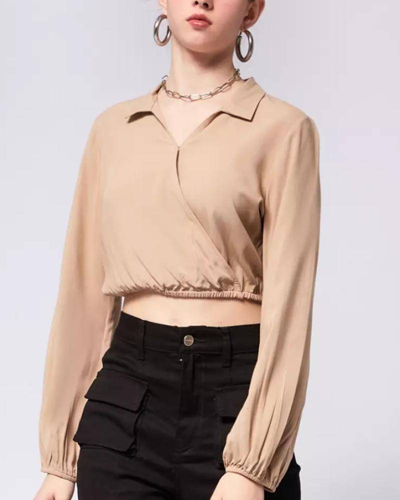 Masih dengan atasan crop top, kali ini ada kemeja crop top dengan bawahan karet yang berbeda. Bagian ujung lengan yang berkaret juga memberikan kesan yang stylish.