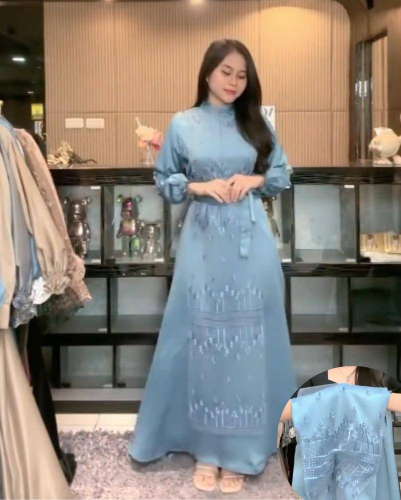 Para pecinta biru merapat! Gamis yang satu ini hadir dengan warna favoritmu. Busana satu ini menggunakan beberapa bahan yaitu, satin premium yang dicampurkan dengan brukat sato. Menghasilkan tampilan yang anggun dan mewah!