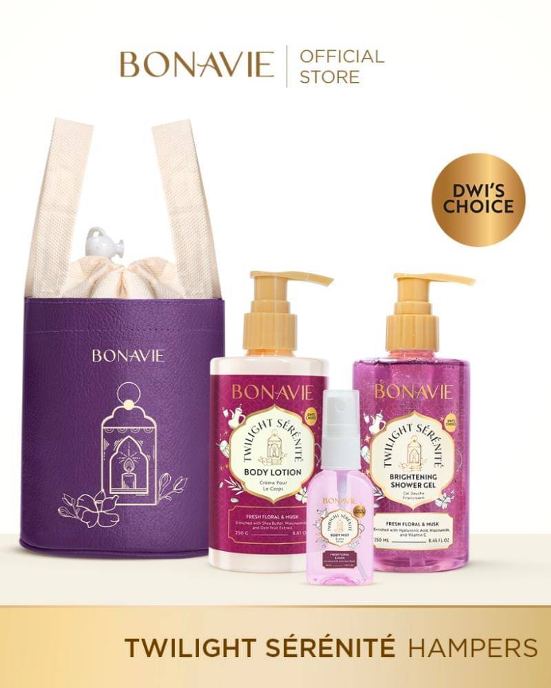 Rasakan ketenangan dan kesegaran di bulan Ramadan dengan rangkaian Twilight Serenite, hasil kolaborasi Bonavie dengan Dwihanda, seorang influencer dan entrepreneur. Gift set ini berisi body mist, body lotion dan shower gel, yang memamerkan paduan aroma dari grapefruit, orange blossom, dan musk.