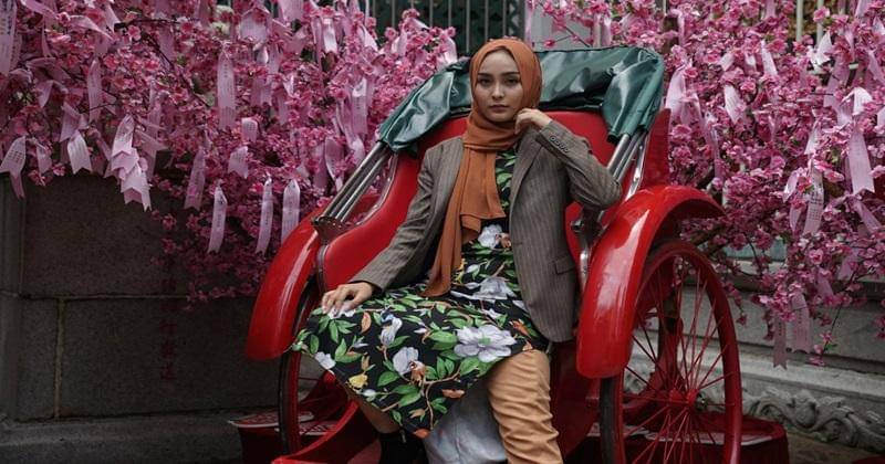 Ia memadukan cheongsam bermotif floral dengan celana khaki dan outer blazer. Untuk hijabnya, bisa memilih pashmina seperti ini.