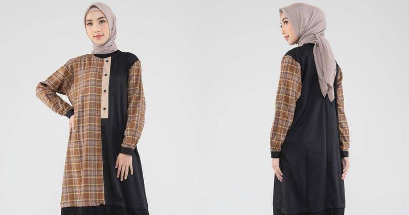 Rekomendasi pertama ini cocok lho untuk Mama yang suka perpaduan warna polos dan bermotif. Gamis tersebut memiliki model kotak-kotak di kedua sisi lengannya dan bagian warna hitam polos di salah satu bagian.