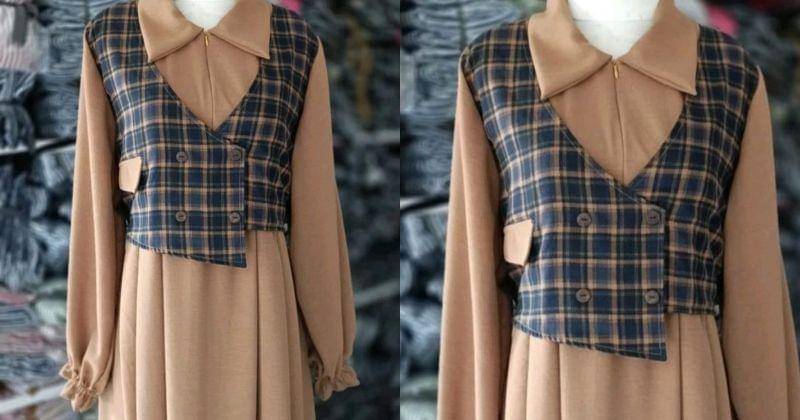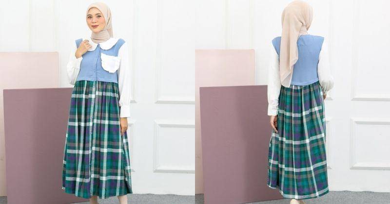 Rekomendasi gamis selanjutnya ada gamis kotak-kotak yang memadukan gaya vintage nih, Ma. Gamis ini memiliki desain kotak-kotak berbentuk rompi.