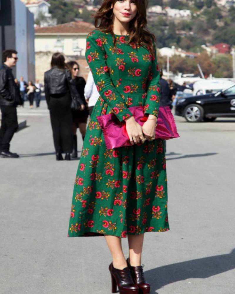 Warna hijau memang identik dengan warna Natal. Nah, dress berwarna hijau dengan motif bunga-bunga merah akan sangat cocok untuk Natal kali ini.