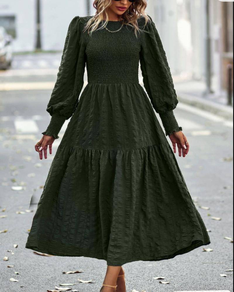 Berencana memilih dress berwarna hijau polos? Maka bermainlah di bahannya. Pilih bahan textured seperti ini untuk kesan yang lebih elegan dan fancy. Detail karet di kedua lengan dan bagian dada membuat penampilan lebih menawan.
