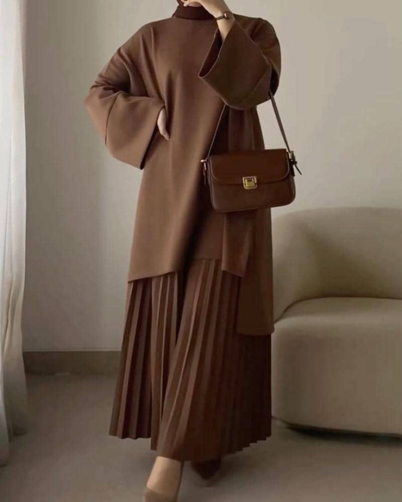 Malam Tahun Baru akan cocok dengan rok pleated dan atasan sweater. Warna yang senada, seperti cokelat ini, memberikan kesan yang elegan.