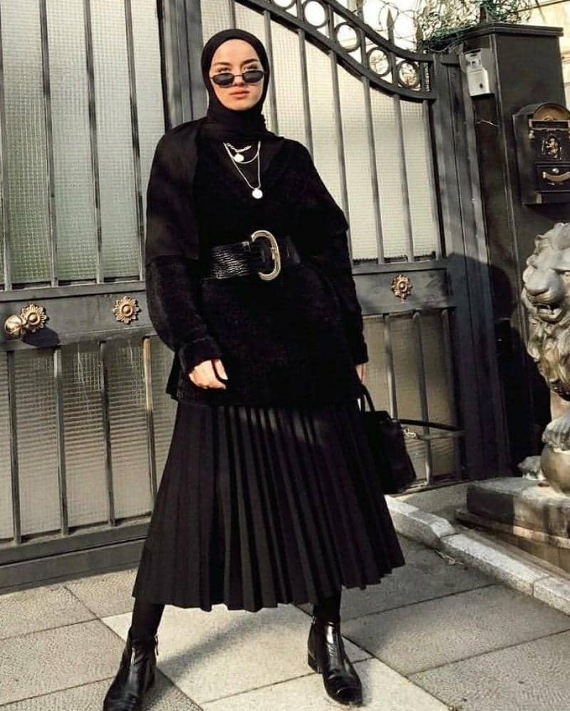Gaya terakhir dan jadi gaya pamungkas adalah outfit serba hitam. Mama bisa mengenakan rok pleated warna hitam dan outer hitam. Untuk kesan yang fancy, tambahkan belt dengan warna senada.