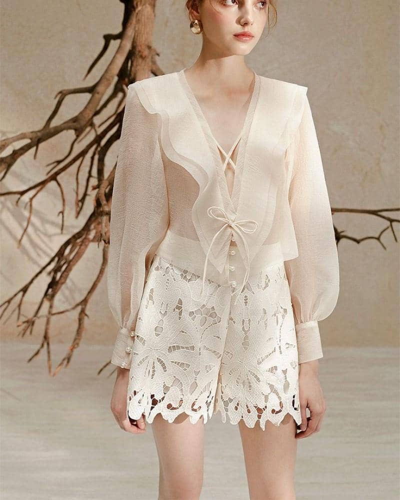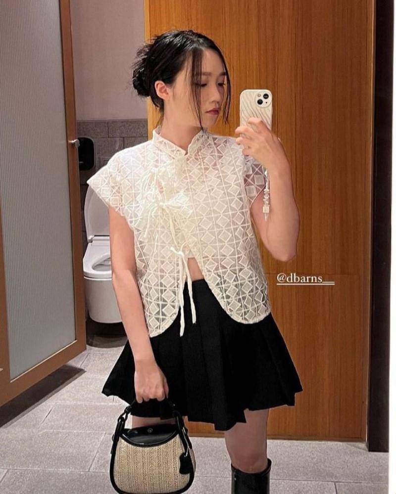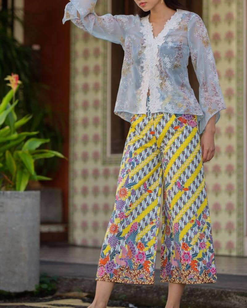 Selanjutnya, Mama bisa memilih atasan dengan potongan seperti kimono. Bahan dari brokat memberikan kesan yang lebih elegan. Sedangkan aksen crop top seperti ini memberikan kesan yang playful dan stylish.