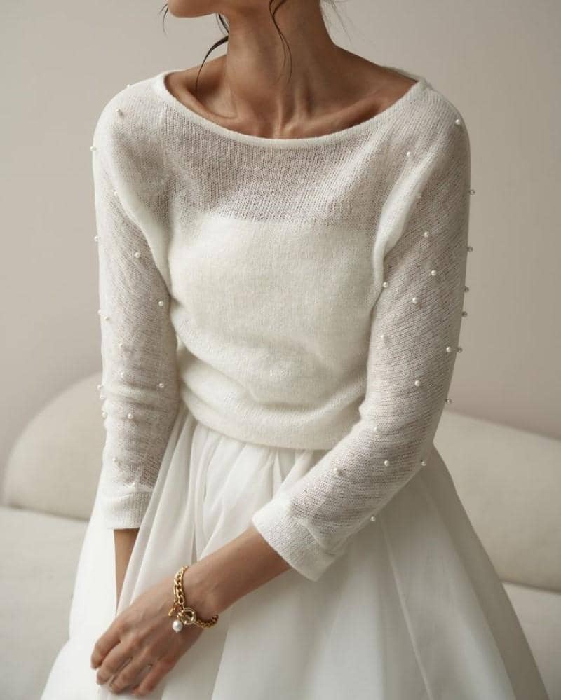 Tampil manis dengan pilihan sweater dan rok. Mama yang berencana tampil feminin bisa memilih sweater dengan detail manis seperti ini.