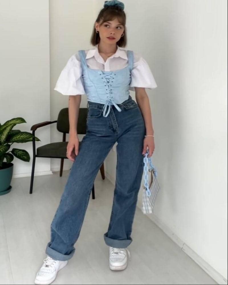 Pertama, gunakan inner seperti kaus atau kemeja. Tambahkan celana dan pakai bustier sebagai outernya. Casual dan stylish!