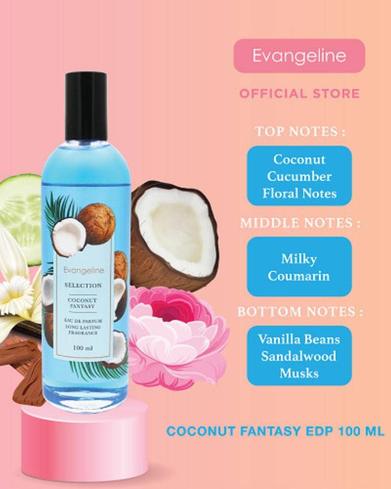 Adapun National Sales Manager Evangeline Parfum, Dyah Kartika, mengatakan, "Masyarakat bisa mendapatkan berbagai parfum dari Evangeline termasuk varian Coconut Fantasy di Tokopedia dengan harga Rp50.000"