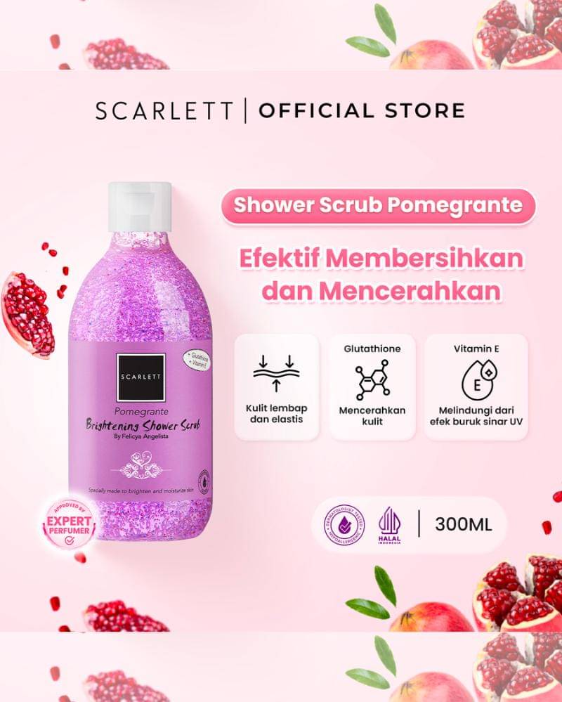 Scarlett Shower Scrub Pomegrante adalah produk pembersih tubuh yang mengandung bahan-bahan alami yang bermanfaat untuk kulit. Produk ini memiliki ukuran 300ml dan memiliki aroma fresh-sweet yang terdiri dari perpaduan aroma buah delima, raspberry, dan peach.